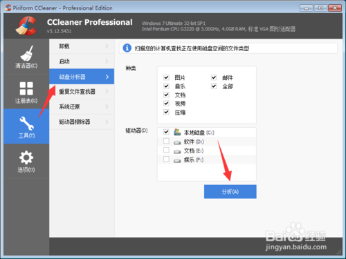 使用ccleaner清理注冊(cè)表以后我們點(diǎn)擊工具,選擇磁盤分析器,選擇好C盤以后點(diǎn)擊分析。