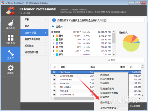ccleaner分析c盤完成以后選擇不需要的垃圾文件,可以按圖片、音樂、視頻等等分類來篩選,然后郵件單擊選擇刪除所選文件就可以了。