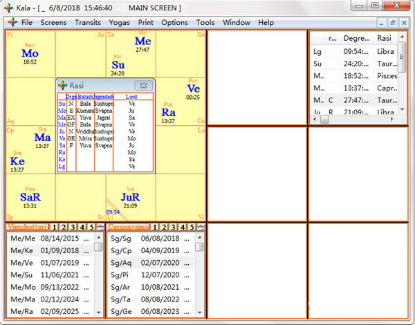 這是卡拉的一個(gè)新屏幕,取代舊版卡拉的Bhava Chalita屏幕。它計(jì)算Brihat Parashara Hora Shastra關(guān)于Avasthas 的章節(jié)中的所有行星Avasthas。廣泛的交互式表格提供了數(shù)學(xué)分析Bhavas的具體影響的數(shù)值。