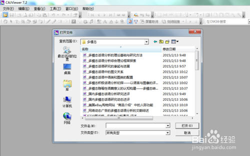 文件打開(kāi)有兩種方式:1. 找到需要打開(kāi)的文檔>右擊>打開(kāi)方式,選擇CAJViewer. 2. 打開(kāi)CAJViewer, 點(diǎn)擊左上角的黃色文件夾按鈕,在查找范圍里找到文件所在的文件夾。 第2種方法比較方便打開(kāi)同一個(gè)文件夾的文檔。