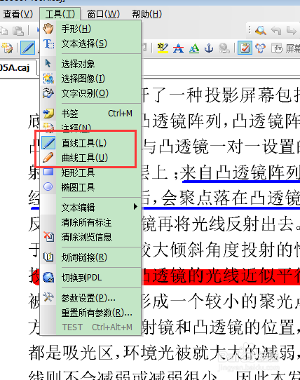 看論文時(shí),有時(shí)需要對(duì)重要的點(diǎn)進(jìn)行標(biāo)注,這是我們可以使用工具欄中的下劃線或者高亮來(lái)標(biāo)注, 也可以使用 工具 - 直線工具或者曲線工具來(lái)標(biāo)注, 如下圖: