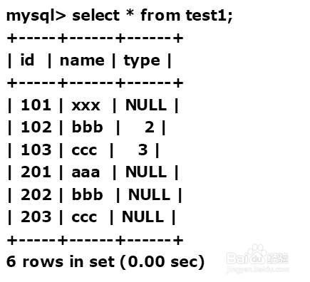 mysql> create table test1(id int,name varchar(5),type int,primary key(id));Query OK, 0 rows affected (0.01 sec)