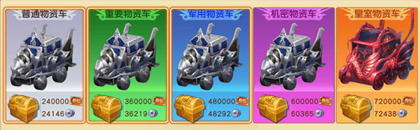 在糧草先行任務(wù)中,物資車有5種不同的檔次:普通,重要,軍用,機密,皇室,物資車的檔次越高,玩家完成任務(wù)時所獲得的經(jīng)驗越高。