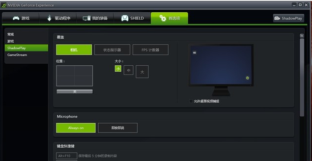 5.有的用戶(hù)會(huì)對(duì)攝像頭、FPS顯示以及麥克風(fēng)按鍵說(shuō)話(huà)進(jìn)行設(shè)置,這可以在“首選項(xiàng)-shadowplay”中進(jìn)行設(shè)置。