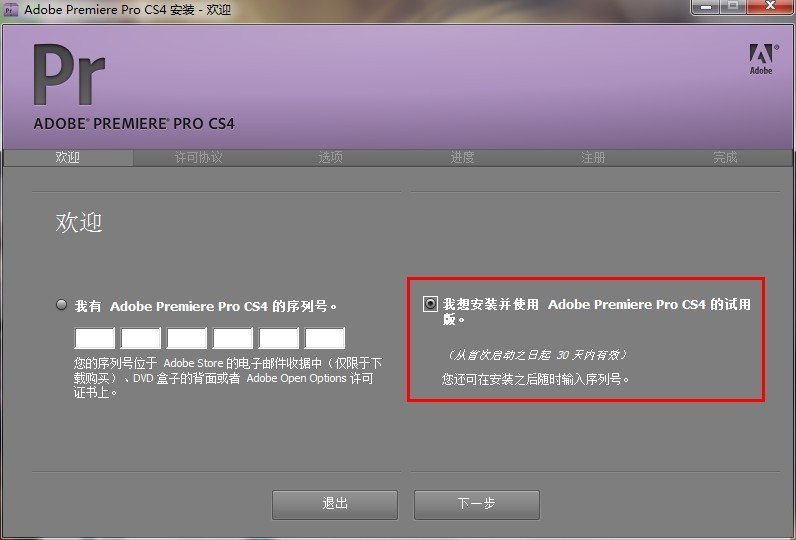 3.開始安裝的時候,選擇試用選項,無需輸入序列號。