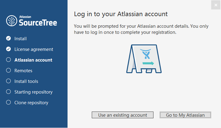 點(diǎn)擊“install”,安裝完成后,打開sourcetree,點(diǎn)擊“user an existing account”,如圖