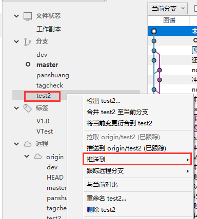 在sourcetree右側(cè)內(nèi)容中的分支列表中,選中創(chuàng)建的分支,右鍵提交,如圖所示: