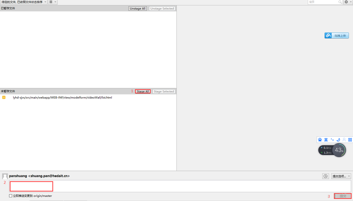 點(diǎn)擊Stage All,填寫提交信息既可以將本地內(nèi)容(暫存區(qū))提交到本地版本庫,如圖所示: