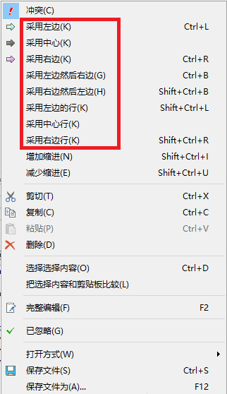 方法一:在相關(guān)的版本處,選中”沖突行”,合并區(qū)默認(rèn)處于合并位置,鼠標(biāo)右鍵,選擇最終沖突地方留下的內(nèi)容,如圖: