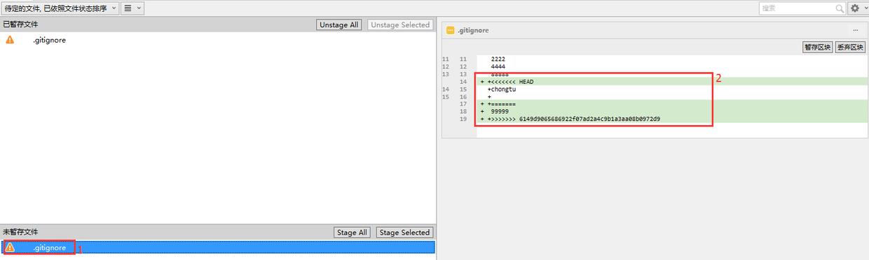 1、點(diǎn)擊未暫存區(qū)域的沖突文件。