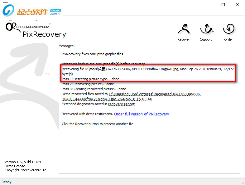 出現(xiàn)提示時(shí),保存恢復(fù)的圖像,為其分配一個(gè)新名稱。默認(rèn)情況下,PixRecovery添加“恢復(fù)”到文件名,即“損壞的圖像.JPG”將保存為“恢復(fù)損壞的映像.BMP”