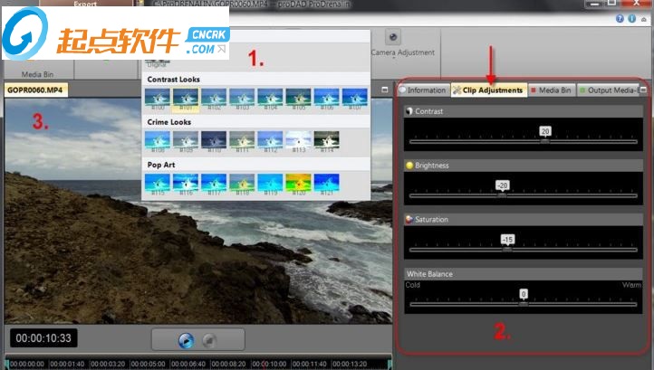 在寄存器剪輯調(diào)整(2),你會(huì)發(fā)現(xiàn)額外的微調(diào)(對(duì)比度,亮度,飽和度和白平衡),視頻或圖像可以進(jìn)一步升級(jí),如有必要。新設(shè)置再次顯示在預(yù)覽(3)。
