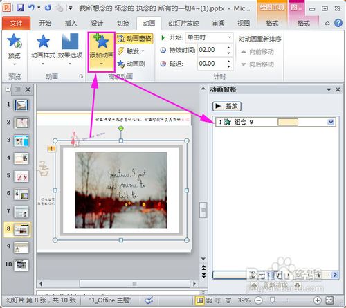 1、打開一個任意的PPT文件,最好里面有文字圖片的,先給其中一張圖片添加上“動畫”,不是切換動畫哦。是“動畫”中的動畫,例如選中圖片后,操作:“動畫”——點擊“添加動畫”——選中“進入”的“輪子”,如圖: