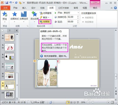 8、“動畫刷”的功用還可以同時應用不同的PPT文件上,前提是必須打開的是powerpoint2010版本,才可以同時應用“動畫刷”的功能哦。