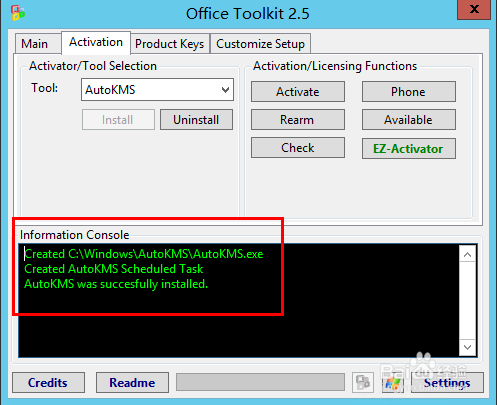 注:Microsoft Toolkit 在這些操作系統(tǒng)上可以激活 Windows 8.1/Server 2012 R2 或 Microsoft Office 2013!這是一組工具和功能來管理授權(quán),部署和激活 Microsoft Office 和 Windows。所有的這些功能輸出顯示在控制臺的信息。所有功能都在后臺運行,并在 GUI 禁用,以防止運行多個功能,如果同時運行,他們可能會出現(xiàn)沖突或造成損壞。 Microsoft Office 安裝自定義功能(自定義安裝程序選項卡),AutoKMS 卸載程序(如果安裝了AutoKMS),AutoRearm 卸載程序(如果安裝了 AutoRearm),辦公卸載和產(chǎn)品密鑰檢查,即使沒有安裝 Microsoft Office 或 Windows/支持工作。欲知有關(guān)各個功能的信息,請參閱該程序的自述。