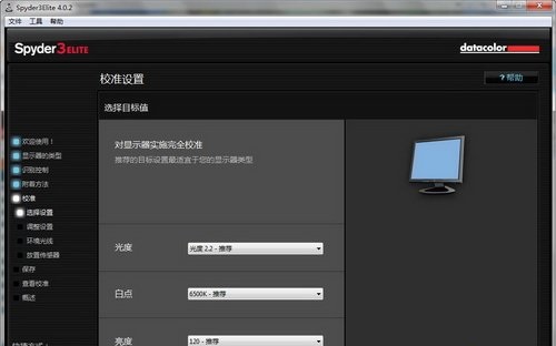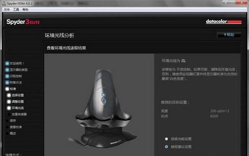 色溫設(shè)定后便是前文提及的環(huán)境光分線分析,Spyder3ELITE軟件會根據(jù)環(huán)境光線來推薦你的設(shè)置亮度和色溫,但實際應(yīng)用中亮度最好不要超過120cd/m^2(移動設(shè)備另算),否則顯示設(shè)備光線會過于強烈。