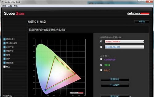 在配置文件概覽中,用戶可以觀察校色后的顯示設(shè)備的色域,以及與AdobeRGB、sRGB和NTSC三種色域作對比,但是更多的數(shù)據(jù)要在“查看信息”和工具中查看。