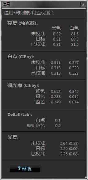 信息第一項亮度,記錄了黑色(黑位)和白色(白位)下的亮度,后者除以前者即可得到顯示設(shè)備的對比度;第二項是白點(白位)的的坐標(biāo)值,這項可以作為校色誤差的參考;第三項是RGB的坐標(biāo)值,色域范圍的量化表示;DeltaE是誤差;光度(Gamma)值,理想值一般為2.2(1.8已經(jīng)很少使用)。
