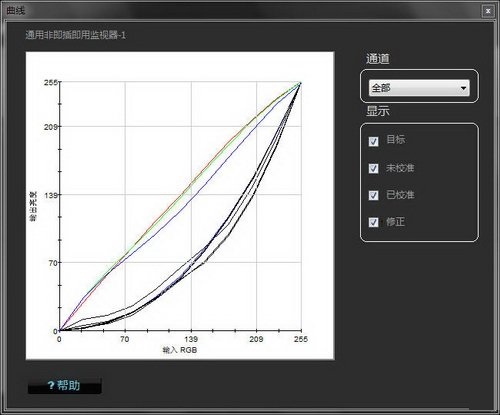 曲線:Spyder3ELITE軟件在這里提供了多種曲線——目標(biāo)、未校準(zhǔn)、已校準(zhǔn)和修正,不過多數(shù)的數(shù)值對于用戶來說意義不大,注意關(guān)注的是已校準(zhǔn)的RGB三條曲線,三條曲線越靠近直線(0,0)(255,255)代表顯示設(shè)備的色彩誤差越小。