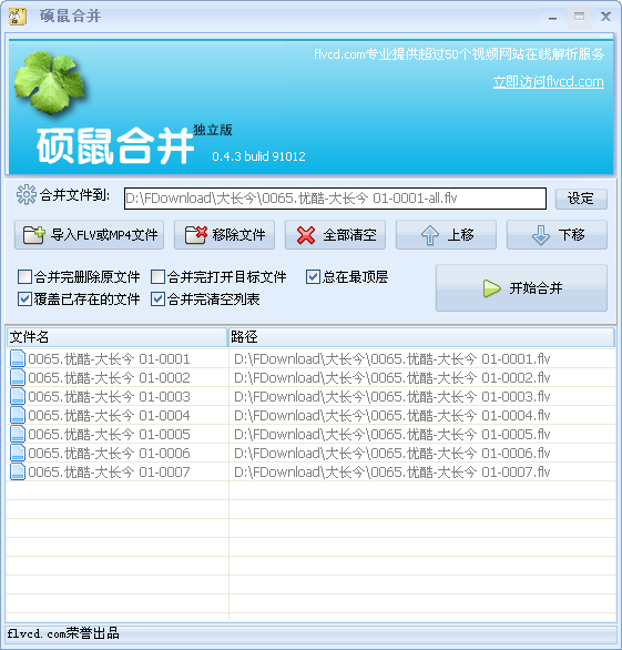碩鼠合并獨(dú)立版是FLV視頻合并軟件,采用mp4box和flvbind命令行來進(jìn)行視頻合并的gui界面軟件。 碩鼠是由著名flv在線解析網(wǎng)站flvcd.com官方制作的專業(yè)flv下載軟件。提供土豆,優(yōu)酷,我樂,酷六,新浪,搜狐,cctv等55個主流視頻網(wǎng)站的解析+下載+合并/轉(zhuǎn)換一條龍服務(wù)。
