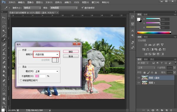 3、選擇”套索工具“,將人物的大概輪廓套選出來,如圖。按”Shift+F5“進行內(nèi)容識別填充。