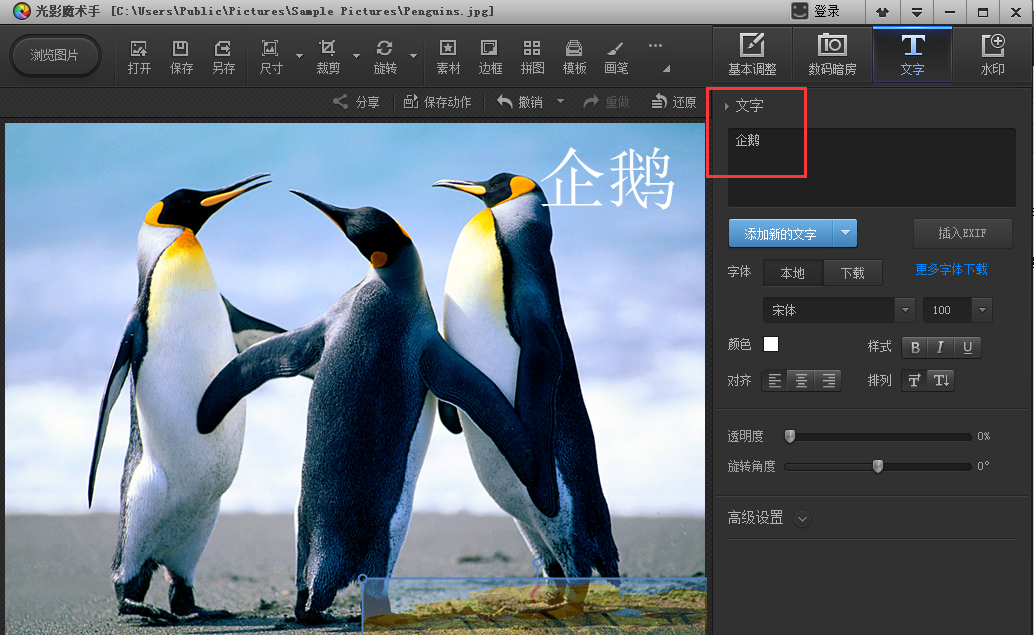 文字水印可隨意拖動操作。橫排、豎排、發(fā)光、描邊、陰影、背景等各種效果,讓文字加在圖像上更加出彩,更可保存為文字模板供下次使用。光影魔術手多種混合模式讓水印更加完美,快來試試吧!