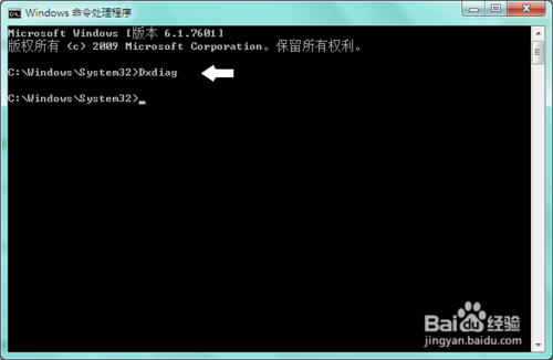 在命令提示符窗口中輸入:dxdiag (按回車(chē)鍵執(zhí)行命令)。