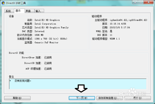 這里顯示了顯卡名稱(chēng)、芯片類(lèi)型、顯存大小、顯示模式、監(jiān)視器型號(hào)、主驅(qū)動(dòng)程序的文件名、是否被WHQL簽名認(rèn)證、是否加速等訊息。如有出錯(cuò),下面會(huì)有顯示→下一頁(yè)。