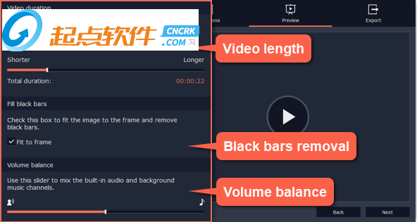 默認(rèn)情況下,視頻將與背景音頻一樣長(zhǎng)。要更改長(zhǎng)度,請(qǐng)取消選擇適合音樂(lè)長(zhǎng)度選項(xiàng),并使用滑塊設(shè)置您想要視頻的時(shí)間。如果您選擇較短的視頻,則某些剪輯可能不會(huì)顯示在最終結(jié)果中。