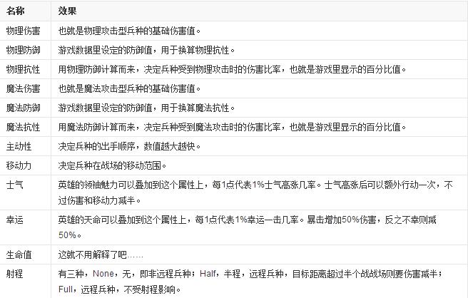兵種有如下主要屬性