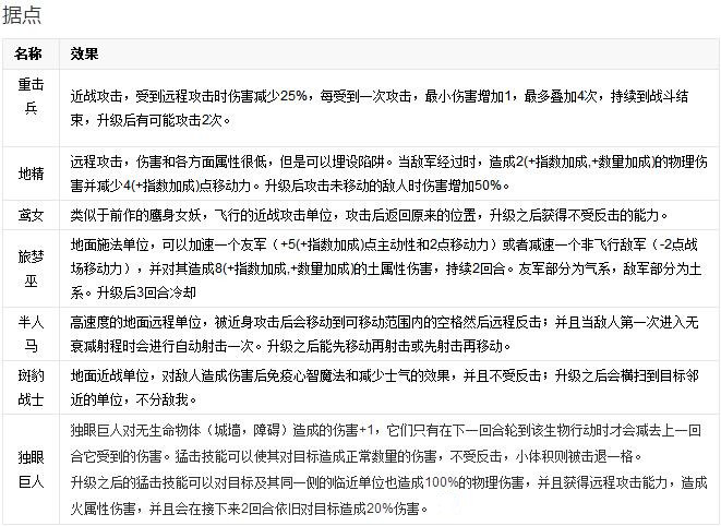 在《英雄無敵6》中,兵種單位的天生屬性更加詳細(xì)具體。列表如下