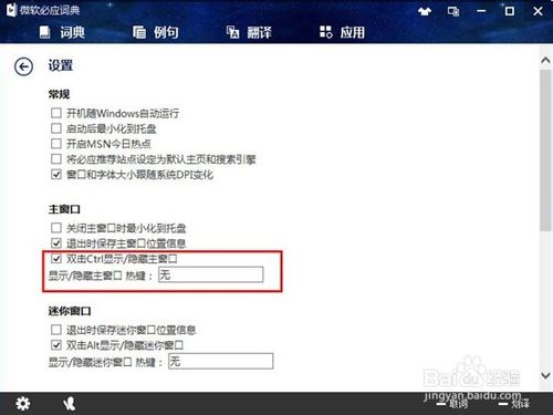 必應(yīng)詞典顯示和隱藏主窗口的快捷鍵是雙擊Ctrl,也可以在必應(yīng)詞典的設(shè)置里面的常規(guī)設(shè)置中,設(shè)置自己習(xí)慣的顯示和隱藏主窗口的快捷鍵