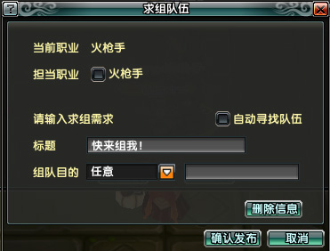 當前沒有組隊的玩家可以發(fā)布求組信息。