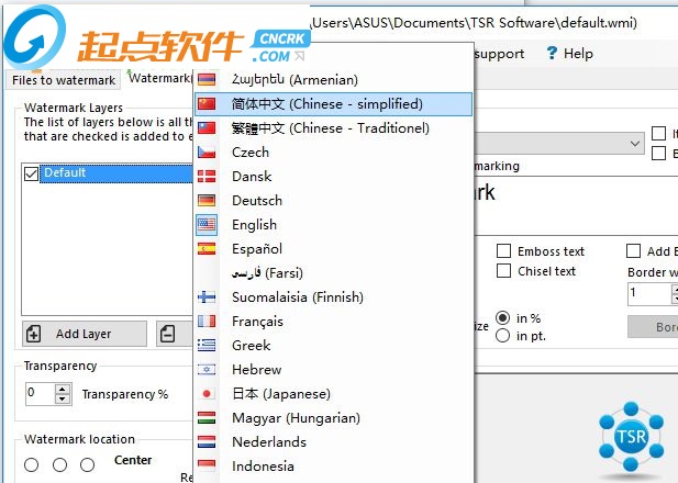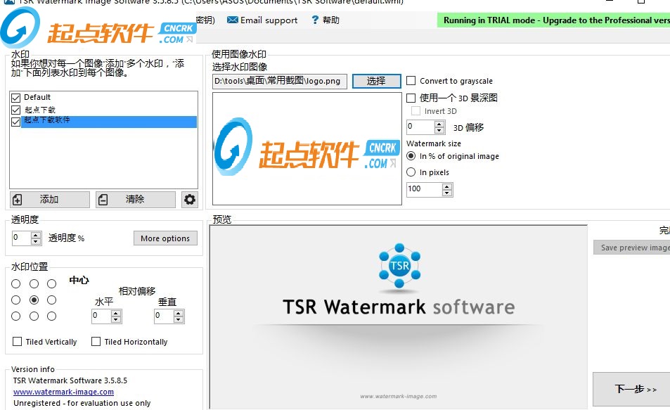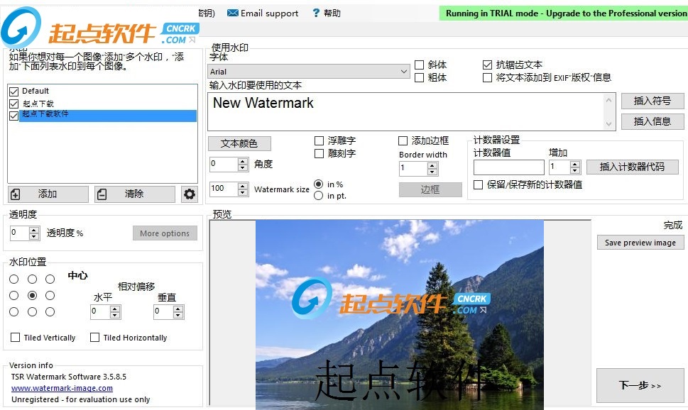 TSR Watermark Image可以添加數(shù)字水印到圖像,透明度支持自定義。你可以使用文字或其他作為水印的圖片創(chuàng)建水印來源。如果您要添加水印的背景,你可以設(shè)置標(biāo)志或文字,或多或少透明,并定義圖像上的透明顏色或選擇在上面的透明色的左上角第一個(gè)像素。您甚至可以使用photoshop,而不是到你的圖片水印,這是一個(gè)讓您所有的圖片上的水印更快更簡(jiǎn)單的軟件。【軟件特點(diǎn)】