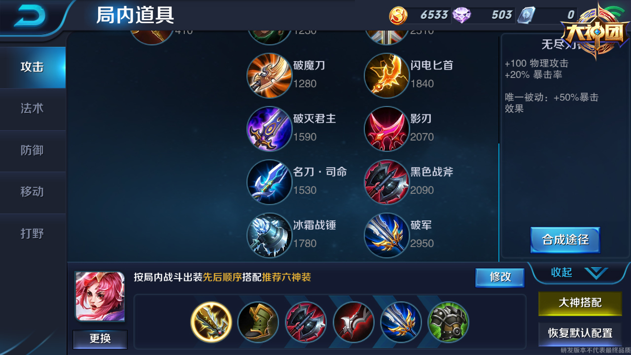半肉出裝則是很多高端局和比賽中,是大神玩家們的唯一出裝方式,除了鐘無艷這種傷害很低的戰(zhàn)士需要全出防御裝備外,即使是花木蘭、韓信這類的刺客型戰(zhàn)士,也都要半肉出裝??梢赃x擇出一兩件防御裝備,出幾件防御裝備是為了更好的存活,只有生存下來才有輸出,像血魔之怒、名刀·司命這種攻防兼?zhèn)涞难b備,就非常適合這些輸出型戰(zhàn)士。