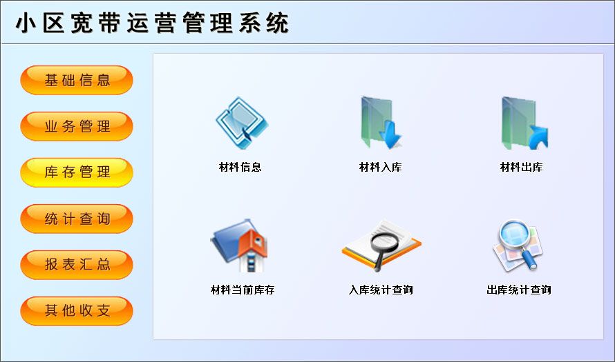 一、基礎(chǔ)檔案:公司信息、部門(mén)信息、人員信息、小區(qū)信息、寬帶套餐、供商信息二、業(yè)務(wù)管理:用戶登記、施工錄入、續(xù)費(fèi)登記、用戶移機(jī)、套餐變更、用戶過(guò)戶、用戶報(bào)停、用戶復(fù)機(jī)、用戶銷戶、故障投訴