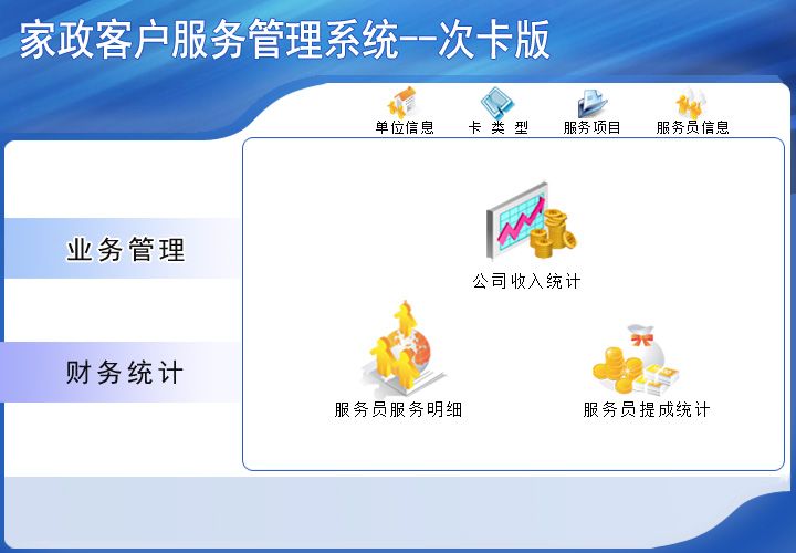 《家政客戶服務(wù)管理系統(tǒng)--次卡版》是一款專為家政公司開發(fā)的一款管理軟件。軟件集客戶辦卡、服務(wù)派工、財務(wù)管理等功能與一體。軟件界面設(shè)計簡潔、美觀其人性化的管理可以使用戶輕易上手,大大節(jié)省工作時間,提高工作效率??茖W(xué)的管理方法會給您帶來無限的效益,該軟件將是您明智的選擇。 《家政客戶服務(wù)管理系統(tǒng)--次卡版》包含如下功能: 基本信息:單位信息、卡類型、服務(wù)項目、服務(wù)員信息 業(yè)務(wù)管理:客戶信息、服務(wù)派工、客戶服務(wù)次數(shù)統(tǒng)計 財務(wù)管理:公司收入統(tǒng)計、服務(wù)員服務(wù)明細、服務(wù)員提成統(tǒng)計