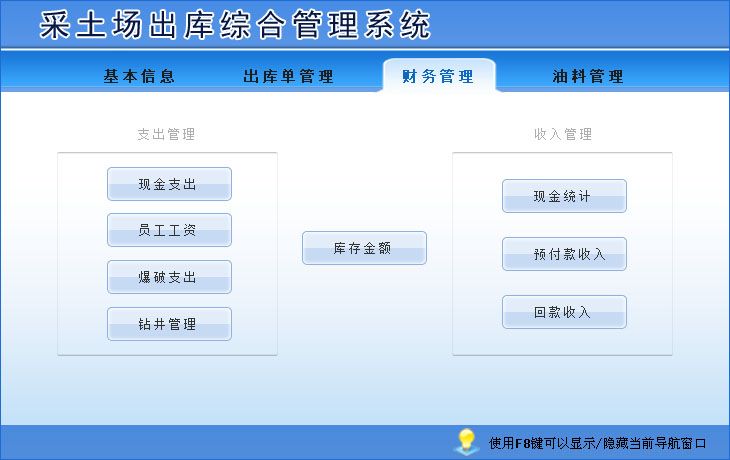 《采土場(chǎng)出庫(kù)綜合管理系統(tǒng)》是針對(duì)山場(chǎng)開(kāi)辟石渣、山皮石 混料、粘土而開(kāi)發(fā)的一款軟件,它可以為山廠開(kāi)出庫(kù)單,各種開(kāi)支管理如現(xiàn)金支出、工資支出,爆破支出、鉆井支出,各種收入管理如現(xiàn)金收入、預(yù)收款收入,回款收入,還有油料的管理,有效管理公司的各項(xiàng)業(yè)務(wù),該系統(tǒng)集信息采集、匯總、查詢、統(tǒng)計(jì)等各種處理為一體,各種操作既可以通過(guò)菜單進(jìn)行,又可以通過(guò)系統(tǒng)的管理樹(shù)導(dǎo)航進(jìn)行。信息錄入智能化,極大提高工作效率。操作快捷、方便,性能高效、強(qiáng)大;使用易懂、易會(huì)。 軟件功能如下: 基本信息包括(員工信息、員工考核、供貨方信息、車輛信息、品名信息、簽卡人、設(shè)備信息、設(shè)備租賃、本單位信息)。 出庫(kù)單管理包括(出庫(kù)單登記、期間統(tǒng)計(jì)、按車牌號(hào)查詢、按簽人查詢、按開(kāi)票人查詢、統(tǒng)計(jì))。 財(cái)務(wù)管理包括(支出管理(現(xiàn)金支出、員工工資、爆破支出、鉆井管理),收入管理(現(xiàn)金收入、預(yù)付款收入、回款收入),庫(kù)存金額)。 油料管理包括(油信息、進(jìn)油登記、加油登記、油庫(kù)存)。