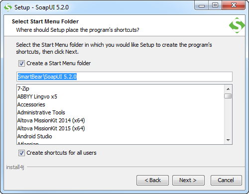 然后,你就可以選擇你想要的快捷方式添加soapUI的開始菜單文件夾