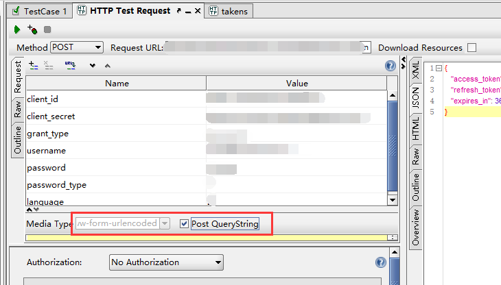 如下圖所示,勾選Media 為application/json 在點(diǎn)擊后面的post QieryString,請(qǐng)求方式即可更改為application/x-www-form-urlencoded 然后傳遞參數(shù)成功