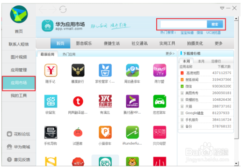 在首頁,點擊【應用市場】頁簽,想裝哪個哪點個秒裝哦~~~五花八門的應用太多啦,找不 到想裝的軟件腫么辦?小編來教您,請在屏幕右上角搜索框內搜索即可哦。