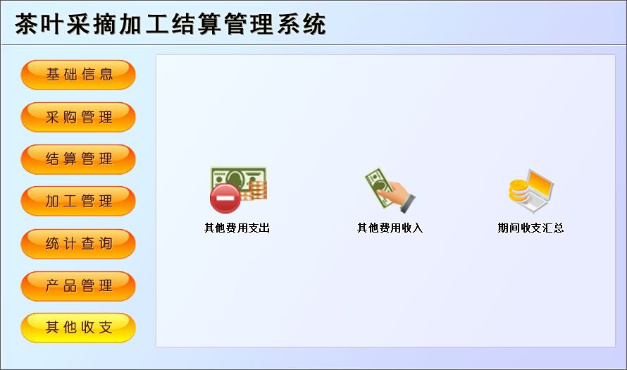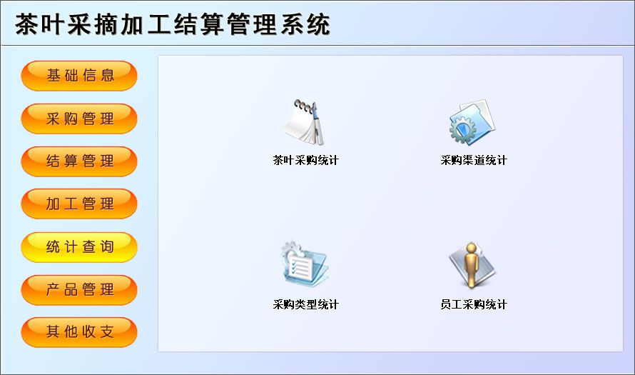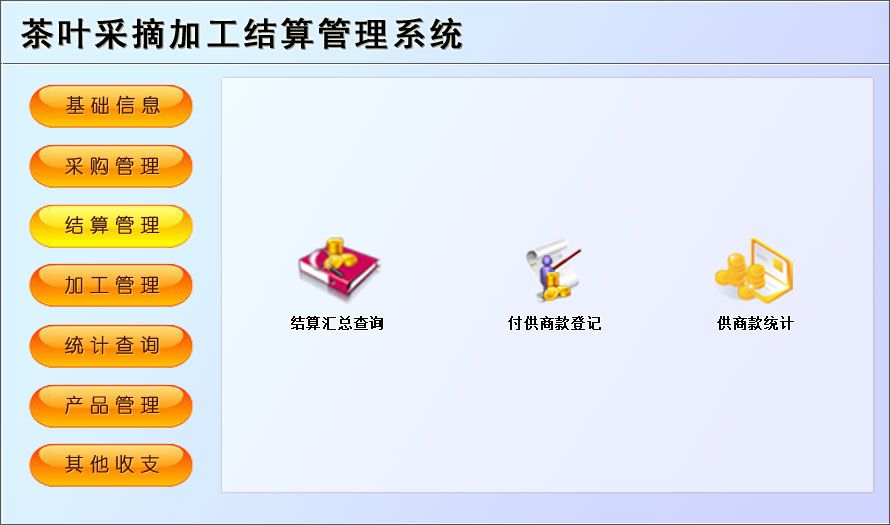 《茶葉采摘加工結(jié)算管理系統(tǒng)》是一款適用于中小茶葉采摘基地園管理工作的需要,主要包括基礎(chǔ)信息、采購管理、結(jié)算管理、加工管理、產(chǎn)品管理等功能。本管理系統(tǒng)多處具有快速輔助錄入功能,操作簡單,易學(xué)、易用;處理功能高效強(qiáng)大,是協(xié)助您的好幫手!