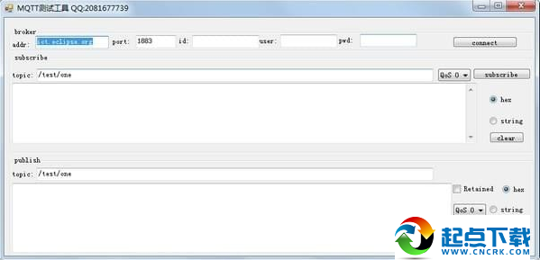 MQTT調試工具,用于MQTT協(xié)議聯(lián)調聯(lián)試,使用方便,畫面簡潔清晰,需要鍵入地址及端口號,ID/用戶名及密碼后連接,能夠用來進行十六進制顯示和ASCII顯示,可以訂閱MQTT topic!【軟件特點】