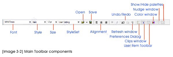 主工具欄包含多個常用的項目,通過鼠標點擊可以輕松訪問。它還為用戶提供當前設置的可視信息,包括當前光標位置的字體,大小和樣式,撤消/重做狀態(tài)等。當主工具欄不顯示,您可以通過選擇窗口菜單下的“主工具欄”菜單命令來切換它。主工具欄不可拆卸,只能在菜單欄右下方的固定位置進行切換。