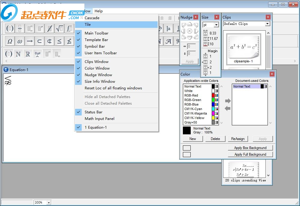 MathMagic的主界面包括帶所見即所得編輯器支持的公式編輯窗口,主工具欄和用戶項目工具欄,各種懸浮窗口,包括剪輯窗口和顏色窗口,微移窗口,尺寸信息窗口,模板調(diào)色板和符號 調(diào)色板,如下所示。