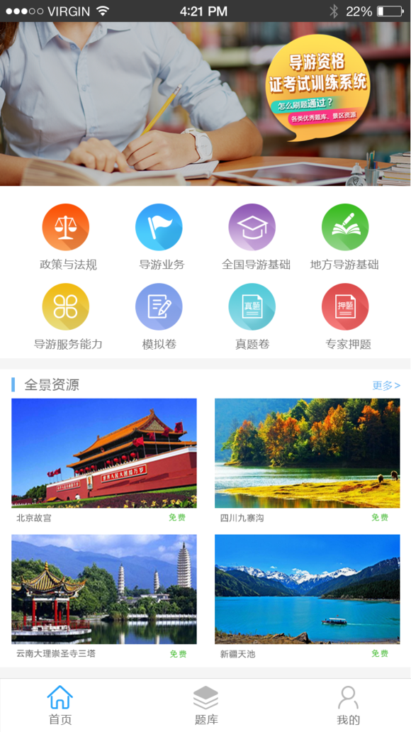 1、簡約設(shè)計(jì),悅目娛心,靈動檢索,資源極速鎖定。2、五大科目,中英導(dǎo)游詞,全國景區(qū)VR,你要的,無所不有。