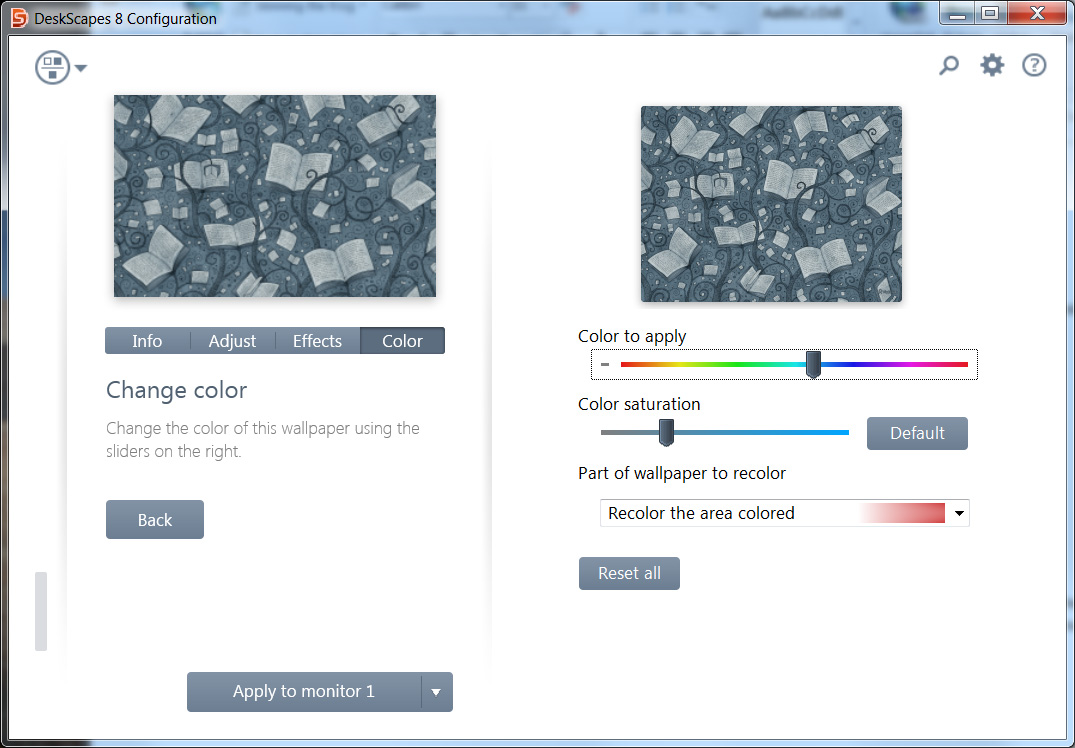 使用簡單的滑塊DeskScapes可幫助您將新顏色應(yīng)用于壁紙。 顏色自定義可應(yīng)用于整個(gè)圖像或僅應(yīng)用于選擇顏色。