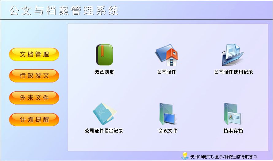 《公文與檔案管理系統(tǒng)》是一套通過行文收發(fā),文印管理和輔項管理等功能相結(jié)合的綜合運用的管理系統(tǒng)。主要包含文檔管理、行政發(fā)文、收費管理、外來文件、計劃提醒等功能。本管理系統(tǒng)多處具有快速輔助錄入功能,操作簡單,易學、易用;處理功能高效強大,是協(xié)助您的好幫手!
