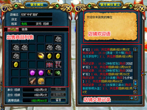 2.通過左邊的商品展示窗口可以瀏覽他正在出售的商品,右邊的攤位信息則可以看到攤主的歡迎語和攤位交易記錄;