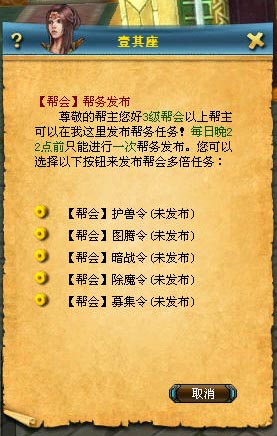 2.發(fā)布周期:每天可以在幫務(wù)任務(wù)中選擇幫會(huì)【護(hù)獸令】、幫會(huì)【收集令】、幫會(huì)【暗戰(zhàn)令】、幫會(huì)【除妖令】、幫會(huì)【募集令】其中的一種每周相同的幫務(wù)任務(wù)只允許發(fā)布一次。